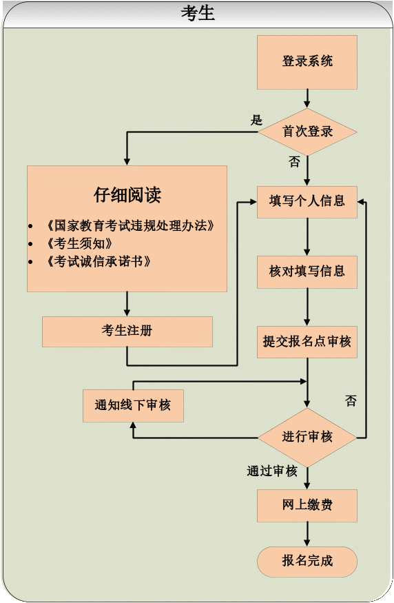 各报名点对考生提交的报名信息进行网上审核,考生可登录报名系统查询审核结果,按审核结果提示进行资料修改、线下审核或进行缴费。