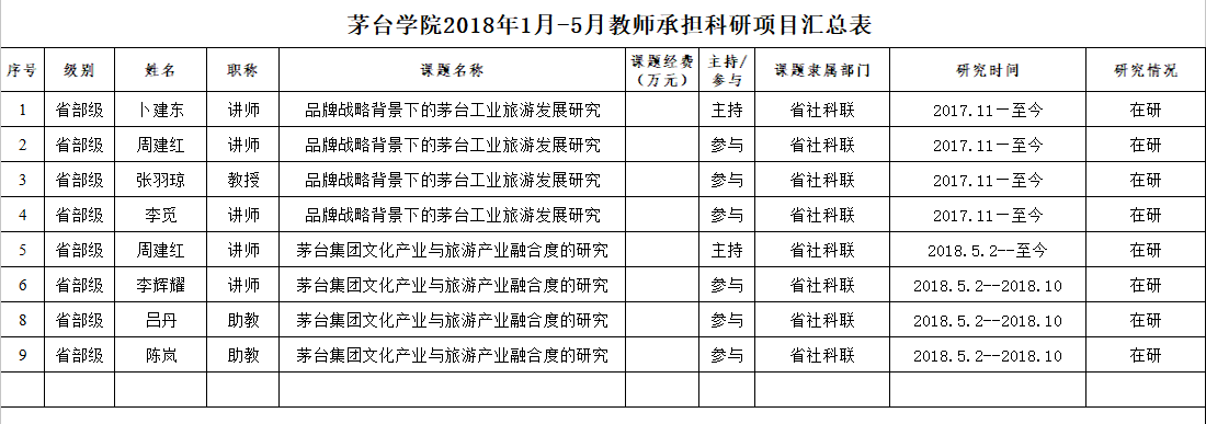 2018年1月-5月教师承担科研项目汇总表
