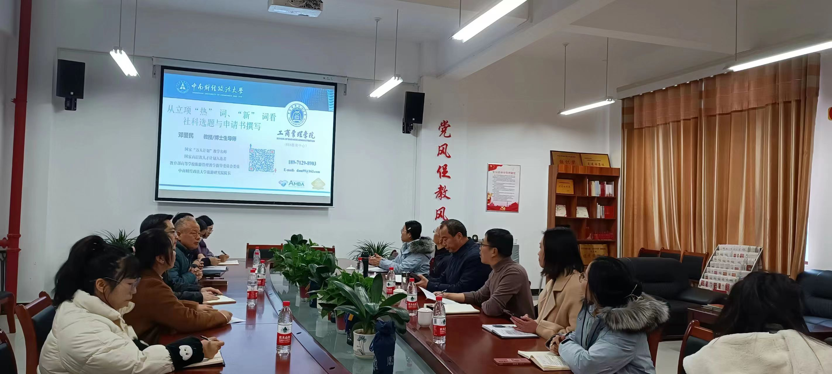 为助力教师更好掌握国社科项目申报书的撰写方法和技巧,提升科研申报能力和项目质量,助推我系国家社科基项目申报取得突破进展。2023年12月17日下午,旅游管理系特邀中南财经政法大学旅游研究院院长邓爱民教授到校,以“从立项‘热’词、‘新’词看社科选题与申请书撰写”为主题,在学校A1-321开展了专题辅导讲座。讲座由系副主任卜建东主持,旅游管理系全体专任教师、工商管理系党支部书记、系主任童俊及部分教师参加。