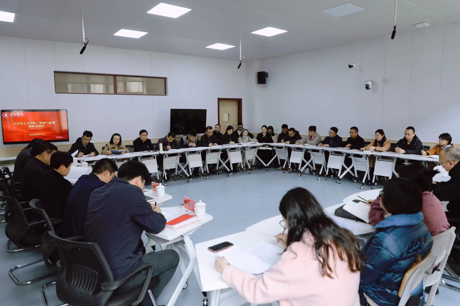 为深入学习贯彻习近平总书记关于高校思想政治工作的重要论述,推动学校思想政治理论课高质量建设,提升《形势与政策》课育人实效,3月19日,万象城娱乐awc线路“形势与政策”集体备课会在留芳楼207智慧教室召开,校长蔡绍洪出席会议并发表讲话,党委副书记王维欣、总会计师邹洪芳、副校长程庆、田戊戌,纪委书记田儒慧、副校长张春林出席会议,学校《形势与政策》课教师、马克思主义学院全体教师参加会议。