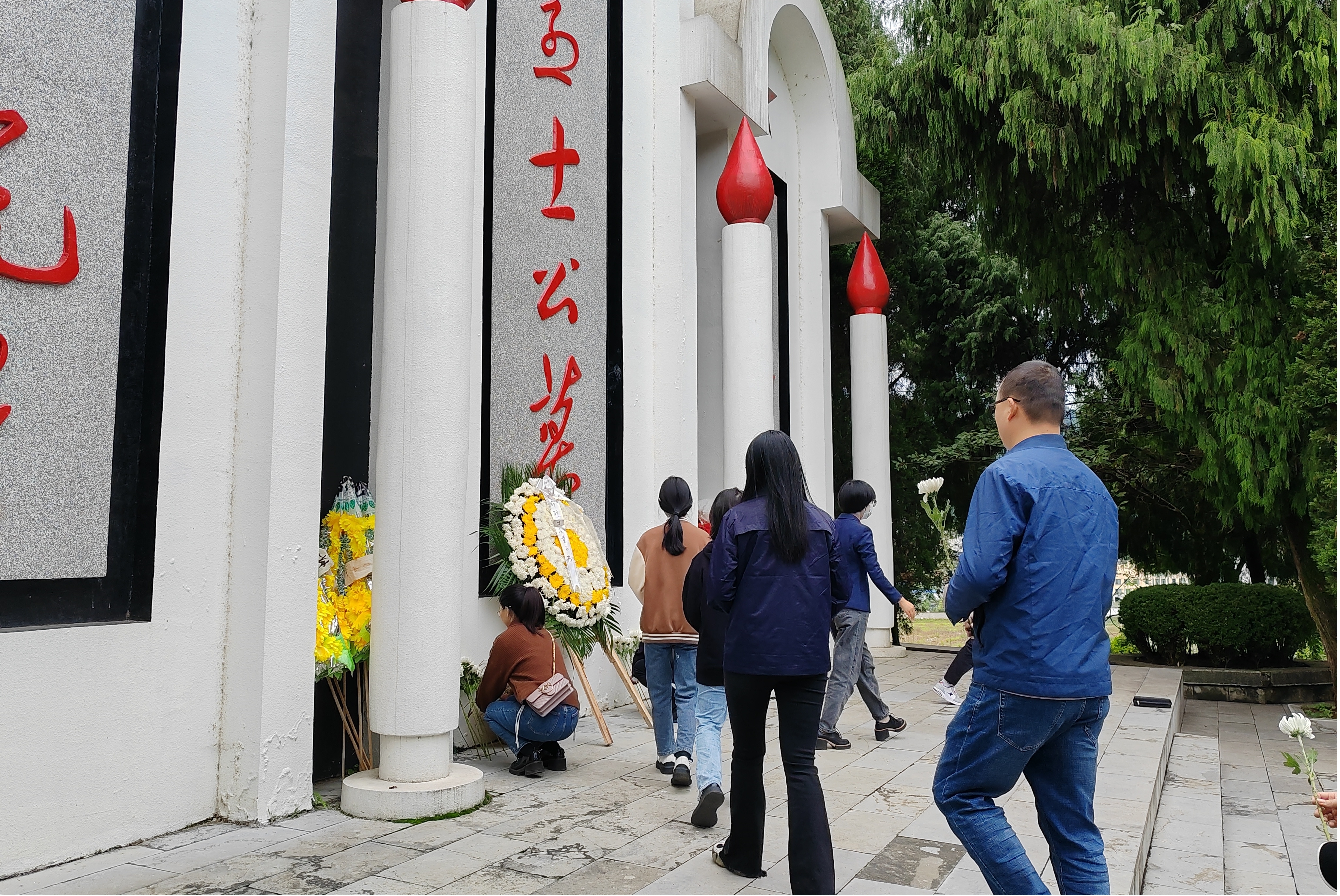 烈士芳名高墙涌,玉石花环表心灵。为缅怀在鲁班场战役中牺牲的革命先烈,在红军烈士公墓前,张珊同志整理挽联,并代表全体党员同志向革命先烈敬献花圈。
