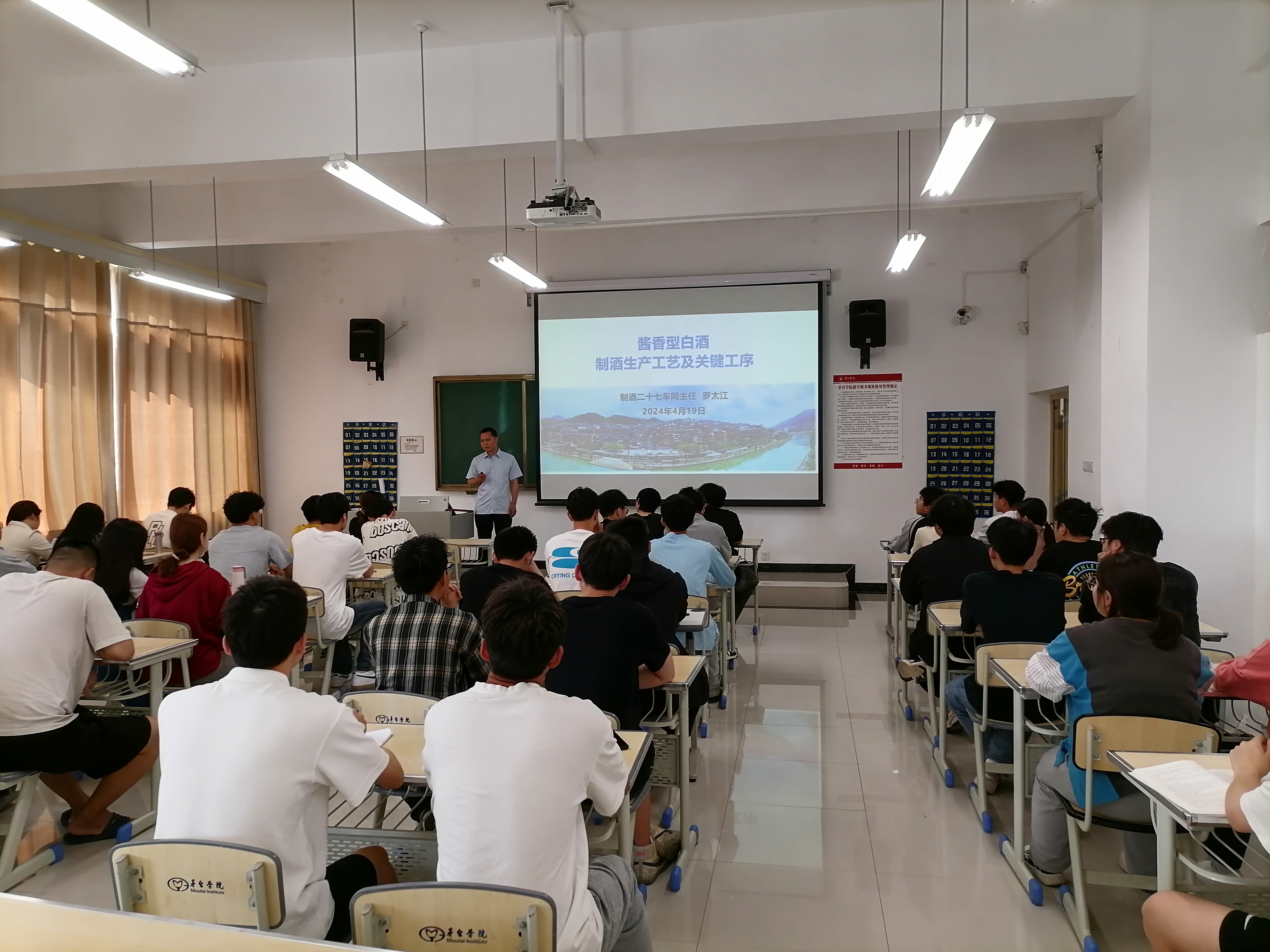 2024年4月19日,贵州茅台股份有限公司制酒27车间主任罗太江到校为我系学生授课。围绕传统大曲酱香型白酒,罗主任详细讲授了生产各环节及关键参数控制方法以及酱香型白酒之美。授课过程中,罗主任结合多年生产经验,生动形象的将制酒技术进行传分享。罗主任还结合自身所感所悟,谆谆教诲学生能够深化酿酒工艺学习、加强日常思考以及树立正确的人生目标。本次课堂氛围良好,学生掌声不断,纷纷表示深刻感受到传统酱酒型白酒生产工艺的魅力,感悟到酱香型白酒之美,期待能够到制酒车间进一步学习,加深理解。