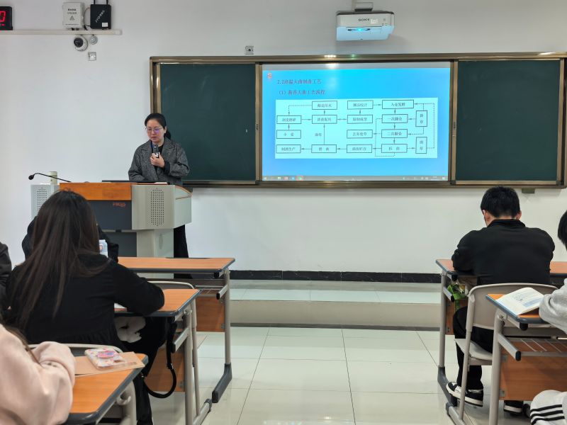 课堂伊始,王主任以 “一片曲、一瓶酒的匠心之旅” 为引,迅速抓住学生们的注意力。她围绕高温大曲、酱香型白酒生产工艺、生产内、外物流等核心内容,展开专业分享。在制曲工艺与大曲质量控制环节,王老师化身 “细节大师”,从高粱、小麦的黄金配比,到 “端午制曲” 的传统时节讲究;从曲块踩制的精准力度,到发酵过程中温度曲线的微妙变化,每一个步骤都融入了酱香型白酒生产的独家经验。“曲是酒之骨,好曲方能酿好酒。” 王老师结合夏季制曲时,通过实时监测曲房温、湿度、灵活调整翻曲时间来提升大曲品质的真实案例,生动展现了制曲工艺的科学与艺术。