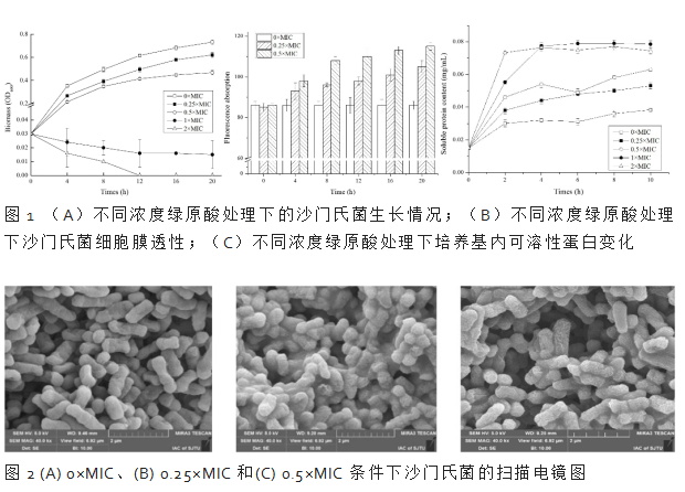 我系杨亮副教授在国际期刊Frontiers in Microbiology(Q2,IF: 6.064)联合发表了题为“Inactivation of Salmonella typhimurium SL1344 by Chlorogenic Acid and the Impairment of Cellular Integrity”的研究性论文。研究由国家自然科学基金(31201290、32160553)、贵州省教育厅科技拔尖人才支持项目(黔教合KY字[2018]082)、贵州普通本科高等学校青年科技人才成长项目(KY[2020]239)等资助。 杜仲是贵州药食同源三宝之一,其富含的绿原酸因具有生物活性而受到广泛关注。本研究在深入研究了杜仲绿原酸(CGA)对沙门氏菌的抑菌活性及损伤机制。在解析CGA对沙门氏菌的MIC及MBC基础上,分析了不同浓度CGA下的沙门氏菌生长情况、细胞透性及细胞形态等指标。发现CGA对沙门氏菌的MIC为6.25 mg/L,在亚致死剂量浓度的CGA中生长,沙门氏菌的细胞外膜透性及可溶性蛋白的释放明显增强,沙门氏菌细胞表现出更多的变形和萎缩,证实了沙门氏菌细胞的完整性在CGA的存在下受损。最后,进一步分析了细胞损伤的可能原因,发现其在CGA处理后膜的流动性增加,这可能是CGA引起细胞外膜刚度降低的原因。本研究从机制层面证实了杜仲绿原酸的抑菌活性,为杜仲内天然产物的开发提供了理论基础。