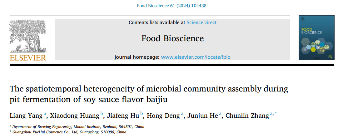 Yang Liang, Huang Xiaodong, Hu jiafeng, Deng Hong, He Junjun, Zhang Chunlin. The spatiotemporal heterogeneity of microbial community assembly during pit fermentation of soy sauce flavor Baijiu. Food Bioscience. 2024, 61: 104438.