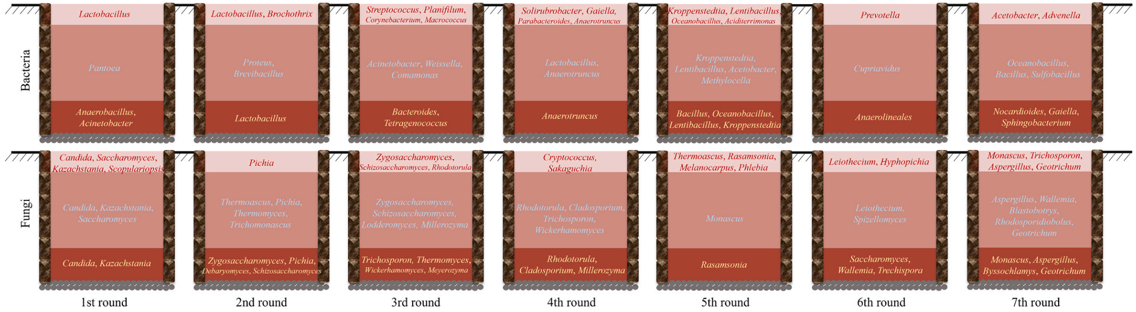 窖内发酵过程中,微生物群落结构对酱香型白酒整个酿造体系及风味形成具有重要的影响。然而,窖内酒醅微生物群落的时空结构和演替规律,以及驱动窖内不同空间位点的酒醅微生物群落组装的关键生境因子尚不清晰。本研究中,我们全面解析了酱香型白酒1-7轮次窖内发酵过程中,窖面、窖中和窖底酒醅微生物群落结构和演替的异同。 基于Lefse统计分析发现,窖面标志性微生物多具有好氧特性,如Streptococcus,Planifilum,而窖中与窖底标志性微生物多为厌氧微生物,如Comamonas,Trichomonascus。进一步通过相关性分析发现,水分,淀粉和pH分别是窖面、窖中和窖底酒醅内微生物群落组装的主要驱动因素。基于PICRUSt2预测,明确窖面、窖中和窖底酒醅优势细菌属分别主要促进了微生物生长代谢,other secondary metabolites和Nucleotide metabolism途径代谢,导致不同空间位点酒醅内的微生物群落富集生长和次级代谢等方面存在差异。本研究全面揭示了酱香型白酒多轮次窖内发酵过程中微生物群落结构、演替的时空差异和关键的生境驱动因子,为调控酱香型白酒酿造过程中微生物群落结构和高水平生产工艺提供科学指导。