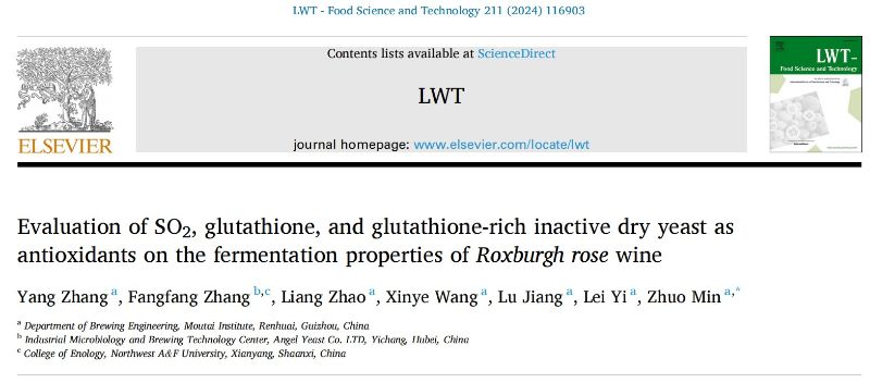 Yang Zhang, Fangfang Zhang, Liang Zhao, Xinye Wang, Lu Jiang, Lei Yi, Zhuo Min. Evaluation of SO2, glutathione, and glutathione-rich inactive dry yeast as antioxidants on the fermentation properties of Roxburgh rose wine. LWT-Food Science and Technology, 2024, 211.