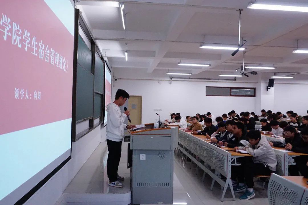 会议伊始,罗粒老师紧扣活动主题,围绕寝室卫生安全,强调寝室长的关键作用,详细讲解了学校制定的安全卫生扣分标准,包括卫生扣分点、违禁物品范围等方面。楼层长代表向阳同学带领全体寝室长学习《万象城娱乐awc线路学生宿舍管理规定》,让同学们对寝室安全和寝室卫生的重要性有了更深刻的认识。