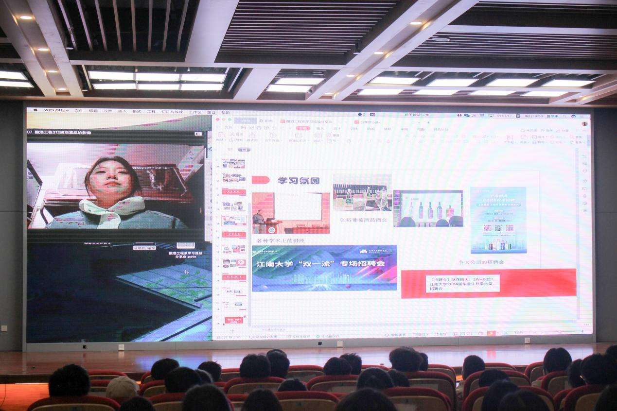 分享会现场还与我系江南大学交流生进行了视频连线,学长学姐云上分享了大学学习经验及江大的学习生活,并鼓励同学们坚持自我、勇于尝试、不断创新,在宝贵的大学时期培养自己的学习兴趣,同学们表示深受鼓舞,对未来充满期待。