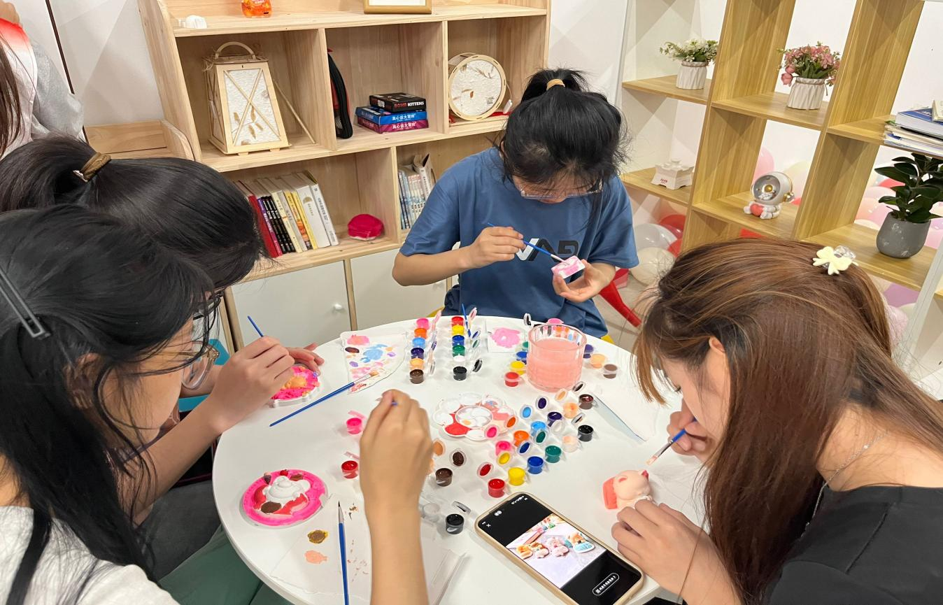 执笔绘青春——DIY石膏娃娃环节,同学们认真挑选心仪的石膏娃娃,在细致的画笔下,原本纯白的娃娃拥有了色彩,变得熠熠生辉。这些色彩不仅是同学们内心世界的投影,也是他们对未来憧憬的象征。笔尖触碰的瞬间不仅是色彩的流转,更是心灵的交流,整个绘画过程是充满想象力和创造力的过程,同学们在描绘石膏娃娃时,不只是在复制一个物体的外观,更是在用自己的理解和情感去诠释它。