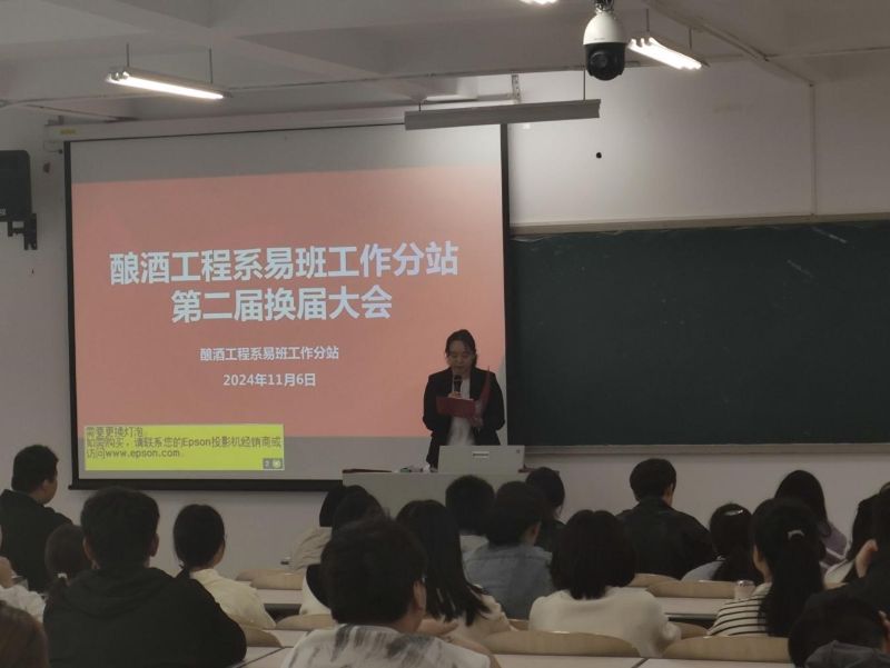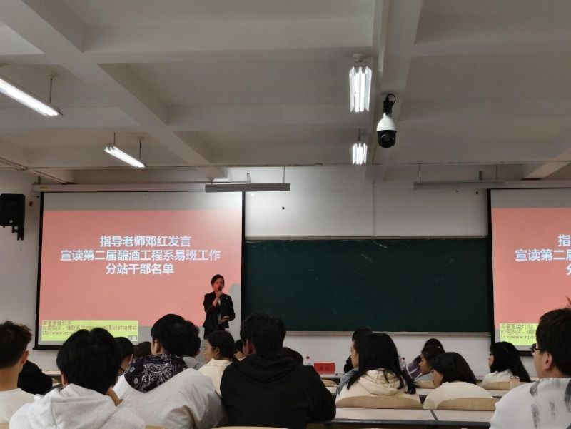 2024年11月6日,酿酒工程系易班学生工作分站在A2教学楼111教室举办第二届换届大会。出席此次大会的老师有酿酒工程系党总支副书记刘晓晓老师、易班学生工作分站指导老师邓红老师、酿酒工程系团总支书记郭蓉老师。