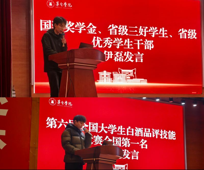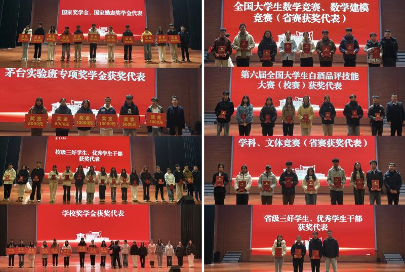 随后,大会进入表彰环节。集中表彰了在学业精进、素质卓越、实践创新三方面取得突出成绩的优秀学生。学业表彰环节涵盖国家奖助学金、校级奖学金及茅台实验班专项奖学金获得者;荣誉表彰环节包含省级、校级三好学生和优秀学生干部;竞赛表彰环节为在数学建模、学科竞赛、文体赛事及全国大学生白酒品评等省级以上大赛中获奖的代表颁发了奖项。