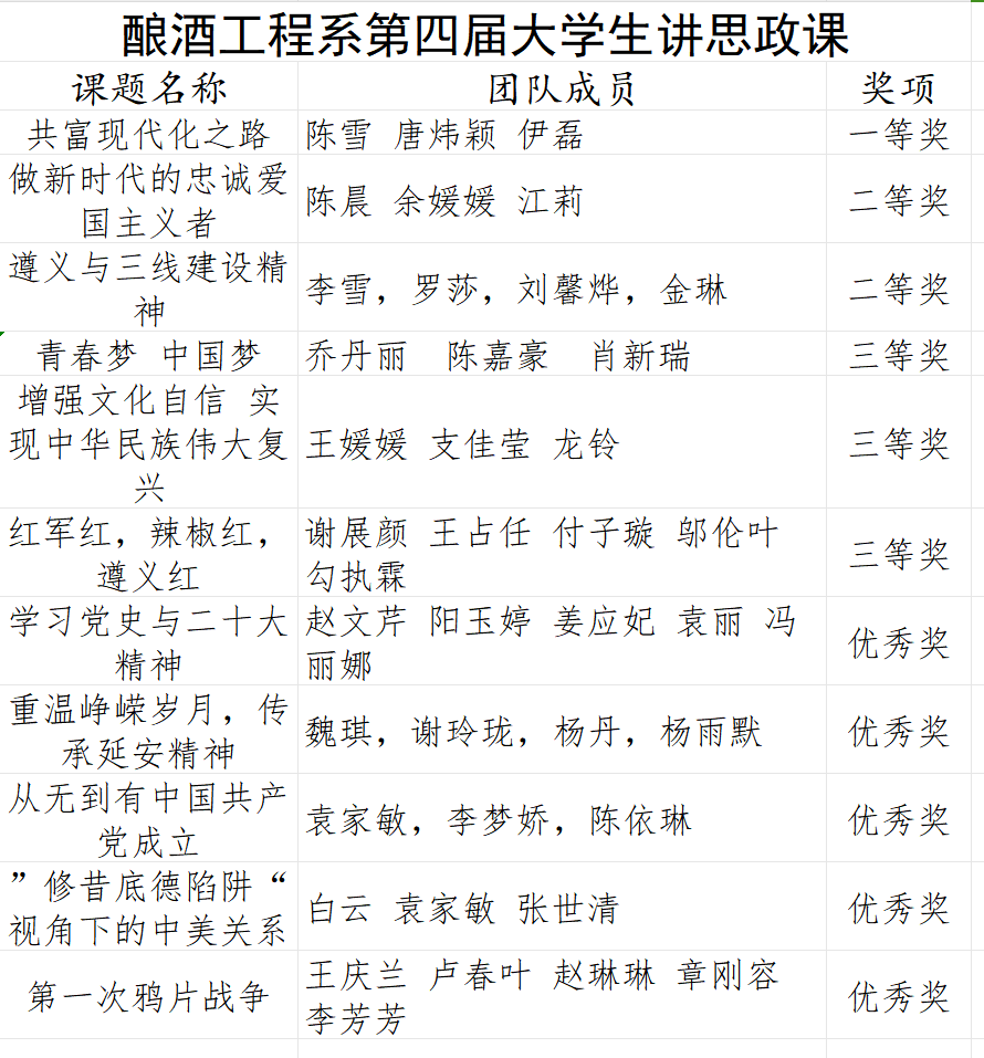此次大学生讲思政课比赛的成功举办,通过讲、思、悟,增强了大学生对思政课的获得感,有效提升了同学们讲授思政课的能力,也更加坚定了同学们讲好思政课的信心。今后,酿酒工程系将继续创新思想政治教育形式,引领学生以青年视角、用青年声音讲好中国故事,传承红色基因,努力成为担当民族复兴大任的时代新人。