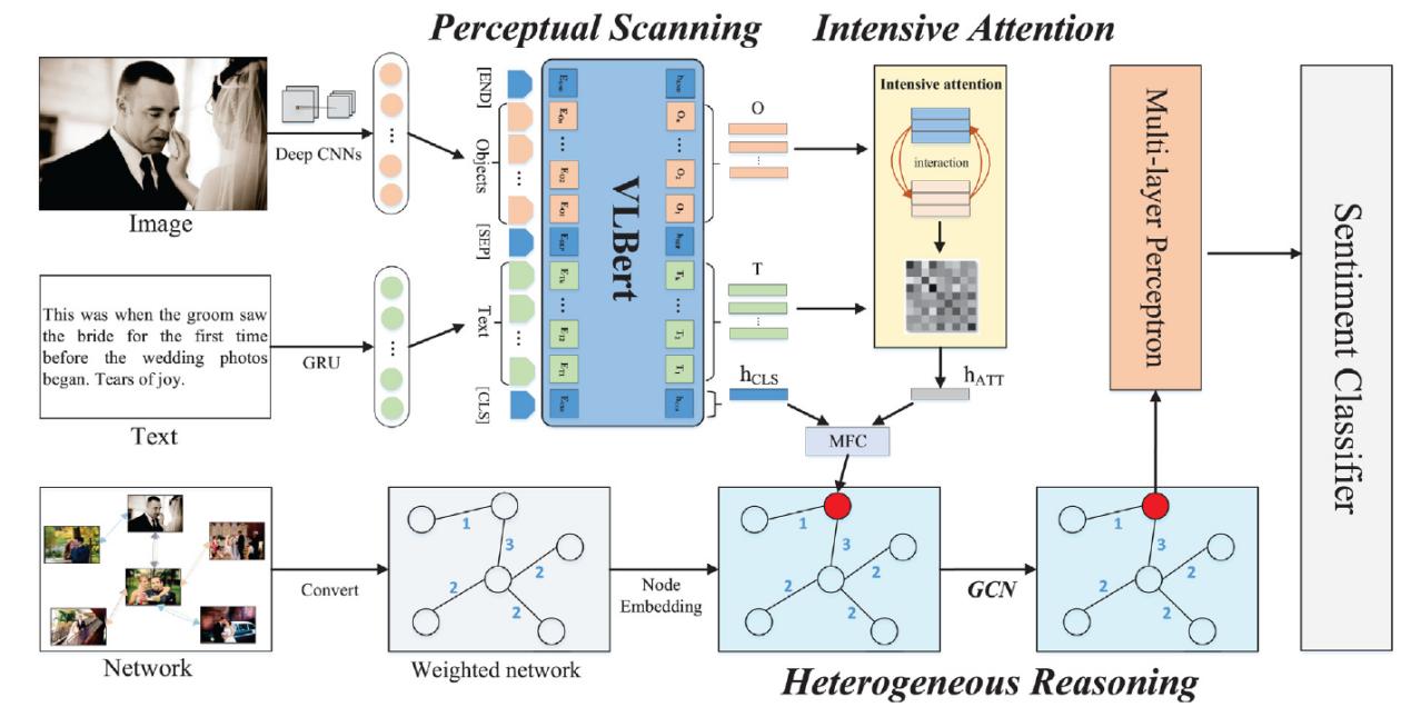 社交网络的兴起为人们提供了展示生活和情感的平台,通常以图像和描述性文本等多模式形式出现。捕捉嵌入在社交多模态内容中的情感具有重要的实用应用价值,同时也面临着巨大的研究挑战。现有方法通常采用基于多模态注意力网络的单轮推理模型来进行情感预测,难以应对需要深入理解和复杂推理的多模态分析任务。为了有效地理解多模态内容并预测出正确的情感倾向,论文提出了用于多模态情感分析的扫描、注意和推理(SAR)模型。具体而言,论文首先设计了一个感知扫描模块,用以粗略地感知图像和文本的内容,以及它们之间的内在联系。然后,论文提出了一种跨模态特征关联学习的注意力模块,以深入理解图像和文本之间的互补特征。最后,将扫描模块和注意力模块的多模态联合特征融合在一起,作为社交网络中多模态节点的表示,以此构建一种基于图神经网络的异构推理模型。通过多模态信息推理,捕捉社交网络中网络传播的影响,并进行情感预测。在三个基准数据集上进行的大量实验证实了模型的有效性和先进性。