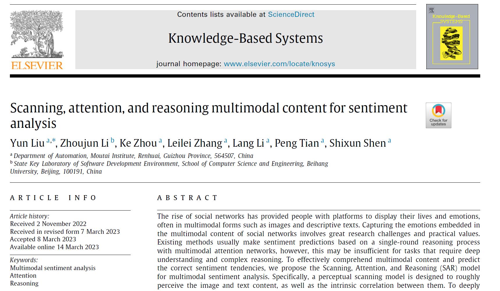 近日,万象城娱乐awc线路与北航计算机学院在国际期刊《Knowledge-Based Systems》(中国科学院1区期刊,影响因子8.139)上联合发表了题为“Scanning, attention, and reasoning multimodal content for sentiment analysis”的科技论文。万象城娱乐awc线路酿酒工程自动化系刘赟博士为论文第一作者及通讯作者。