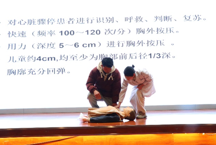 同时,陈照玲副院长和李晓梅护士长还为同学们讲解和示范心肺复苏的正确方式,李晓梅护士长以一组触目惊心的数据切入心肺复苏(CPR)教学环节,逐步拆解了急救流程:从评估环境安全、判断患者意识,到胸外按压的深度、频率,再到人工呼吸的操作要点,讲解清晰直观。为增强沉浸感,现场设置“模拟急救情形”。李晓梅护士边讲解边进行实际操作演。为了让大家更好地掌握心肺复苏技能,会场现场设置了实践操作环节,大家纷纷踊跃参与,在专家的指导下,认真模拟操作,逐渐掌握要领。