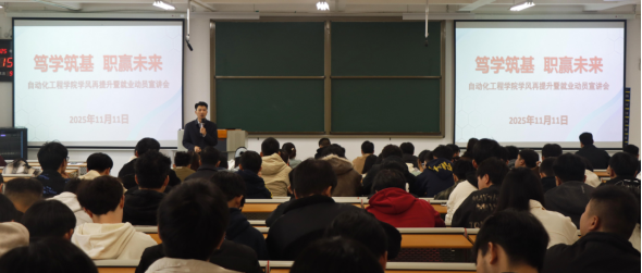 为进一步浓厚学院学习氛围,强化学生自主管理、主动学习意识,帮助2026届毕业生精准把握就业脉搏,助力高质量就业。2025年11月11日下午,自动化工程学院“笃学筑基、职赢未来”学风再提升暨就业动员会在A1-512教室顺利举办。活动邀请到学校招就部副部长刘秋、主办李华出席,学院院长周克、党总支副书记肖启霞,2026届全体毕业生及大二、大三部分班干代表参加,会议由学院党总支书记欧信忠主持。