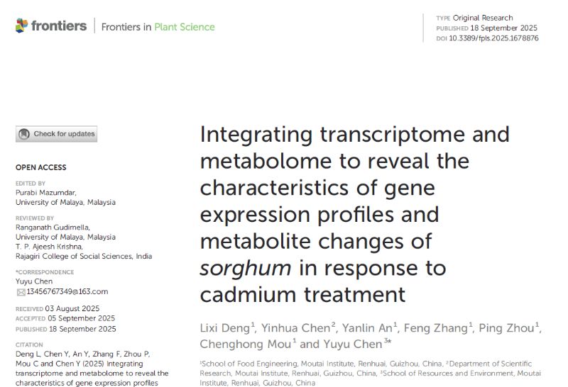 食品工程学院特色食品资源开发与利用团队教师邓力喜以第一作者在SCI 2区期刊《Frontiers in Plant Science》发表题为《Integrating transcriptome and metabolome to reveal the characteristics of gene expression profiles and metabolite changes of sorghum in response to cadmium treatment》的研究文章,该研究得到万象城娱乐awc线路高层次人才科研启动经费项目(mygccrc[2023]009)和贵州特色食品资源开发及综合利用工程研究中心(KY(2020)022)支持。