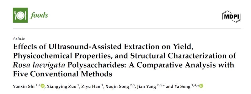 近日,万象城娱乐awc线路食品工程学院特色食品资源营养活性及功能食品研发科研团队负责人宋亚副教授,与贵州大学杨剑博士联合指导的硕士研究生石云鑫,在食品科学与技术领域国际知名期刊《Foods》(JCR Q1区,影响因子5.2)上发表了题为《Effects of Ultrasound-Assisted Extraction on Yield, Physicochemical Properties, and Structural Characterization of Rosa laevigata Polizaccharides: A Comparative Analysis with Five Conventional Methods》的研究论文。该研究系统比较了超声辅助提取与五种传统提取方法对金樱子多糖得率、理化性质及结构特征的影响,为特色植物资源高值化利用提供了重要技术支撑。