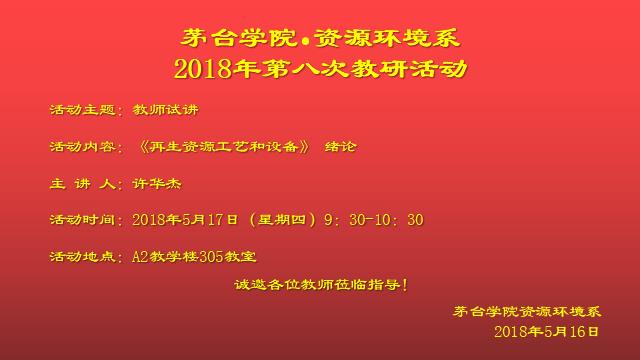 2018年5月17日,资源环境系教师许华杰,试讲了课程《再生资源工艺和设备》 绪论部分,课件背景朴素、字体大小合适、排版合理。讲课过程中课件与实际联系、结合自己的研究,有机结合、相互补充。讲课声音洪亮、吐字清晰,达到试讲的效果。