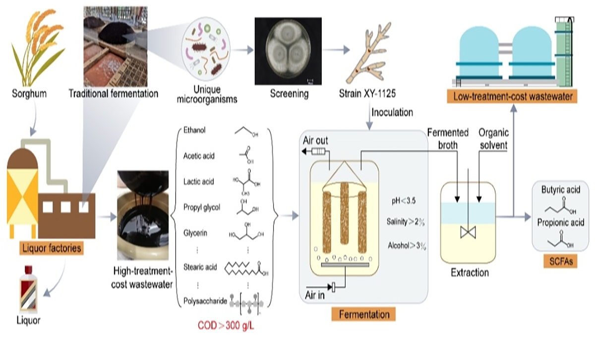 白酒酿造废水的处理处置是我国白酒行业可持续发展过程中必然面对的基本问题,将白酒酿造废水进行资源化利用是解决白酒酿造废水处理处置较有前景的绿色处理方式。郑羽西老师及其团队通过充分挖掘茅台镇独特的微生物群落,首次报道了一株罕见的多重胁迫耐受丝状真菌,创新性的用于直接处理超高浓度的酱香白酒酿造废水。在COD降低90%以上的情况下,将废水中的高浓度有机物转化为短链脂肪酸(SCFAs),其产生的SCFAs浓度超过目前同类文献报道最高值的2倍(19.8 g/L)。