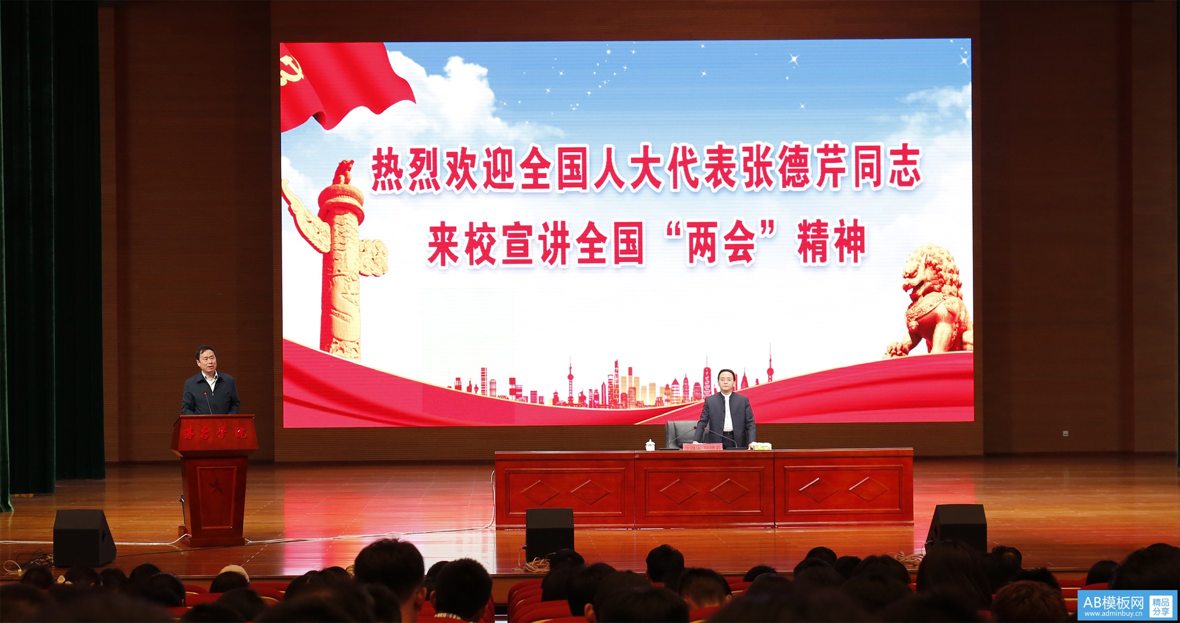 4月17日下午,万象城娱乐awc线路在校礼堂隆重举行学习贯彻全国两会精神报告会。第十三届全国人大代表、集团公司党委委员、副总经理、习酒公司党委书记、董事长张德芹同志应邀到会宣讲全国两会精神,并在与师生进行学习交流互动中回答了大家关心的问题。学院党委书记赵明仁主持报告会。