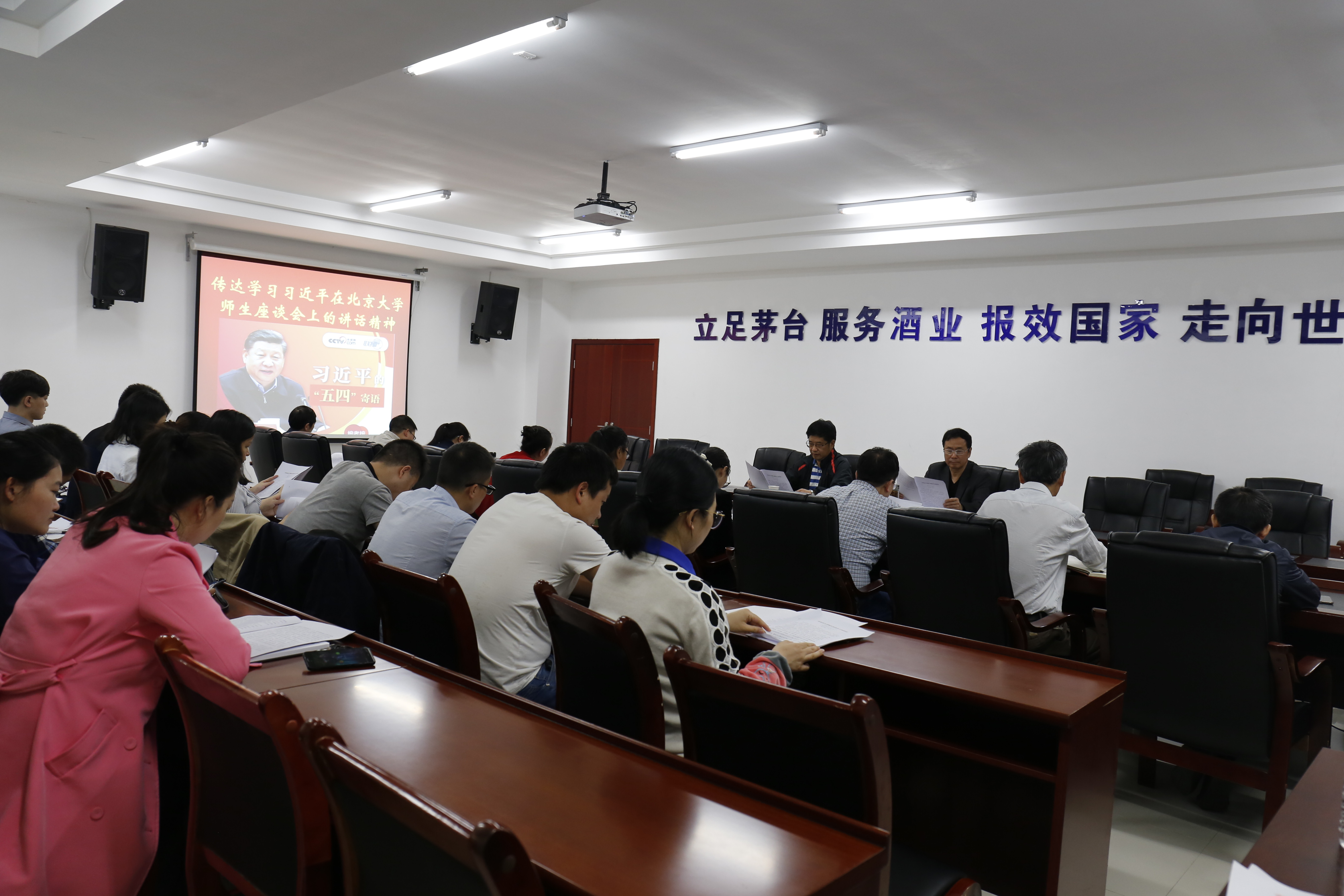 与会者在党委副书记叶远鸣引读下,学习了习近平总书记5月2日在北京大学师生座谈会上的重要讲话。