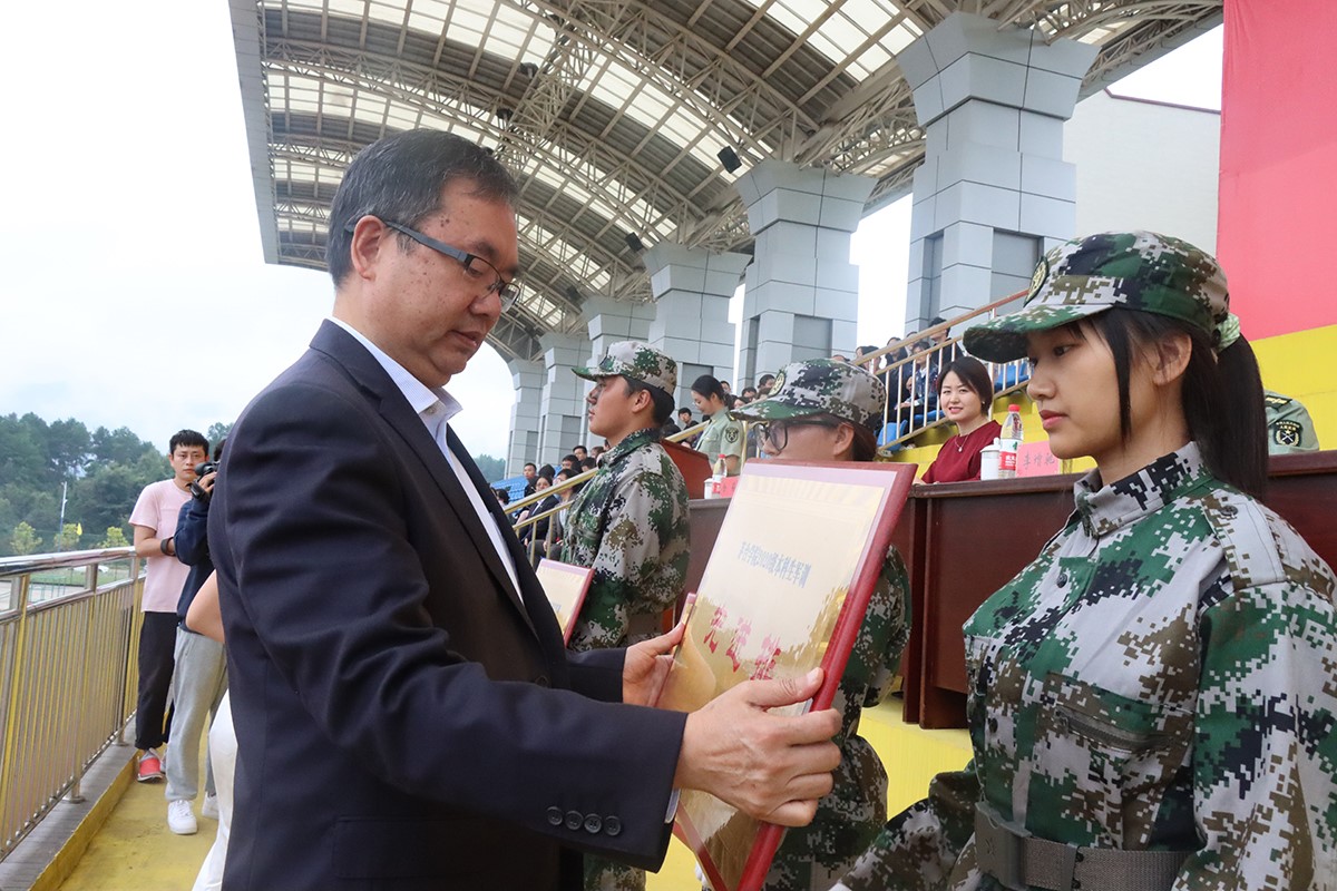 万象城娱乐awc线路党委副书记、院长封孝伦颁授2020级学生军训先进排牌匾