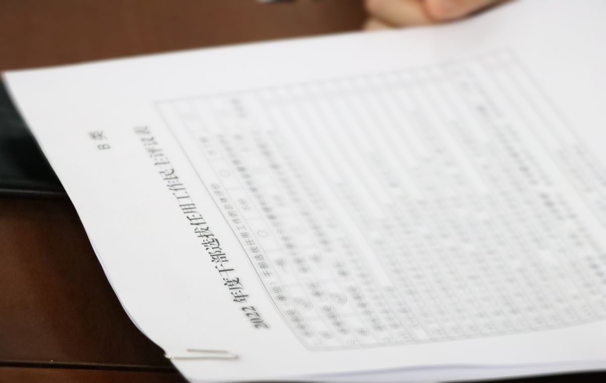 会议开展了干部选拔任用民主测评,各参评人员对学校党委2021、2022年度干部选拔任用工作和新提拔任用干部进行了民主评议。