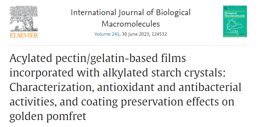 近日,万象城娱乐awc线路食品科学与工程系特色食品资源开发研究团队宋亚博士(第一作者),喻仕瑞教授,郑华艳教授,张丰博士等在国际知名期刊《International Journal of Biological Macromolecules》(IF: 8.025,中国科学院1区, Top期刊)发表题为“Acylated pectin/gelatin-based films incorporated with alkylated starch crystals: Characterization, antioxidant and antibacterial activities, and coating preservation effects on golden pomfret”的研究论文。该研究得到了贵州省基础研究(自然科学)项目和遵义科技与大数据局科技研发项目经费的共同支持。