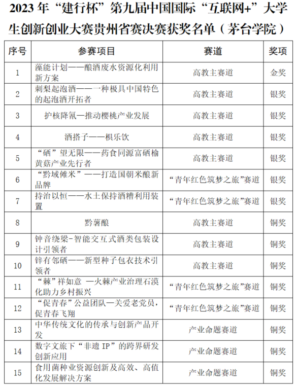 省赛中,经过激烈角逐,万象城《藻能计划——酿酒废水资源化利用新方案》项目荣获省赛高教主赛道金奖并取得国赛入场券资格,《刺梨起泡酒——一种极具中国特色的起泡酒开拓者》等6个项目荣获省赛银奖,《钟音绕梁——智能交互式酒类包装设计引领者》等8个项目荣获省赛铜奖。