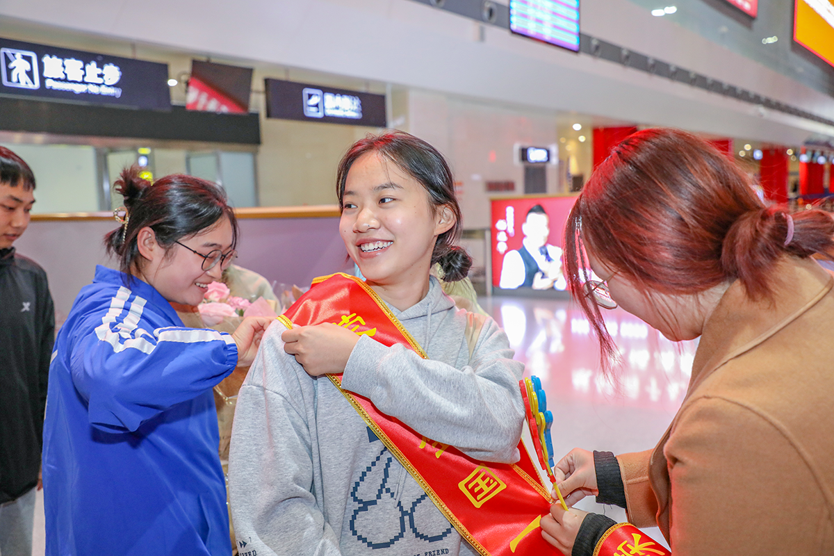绵绵细雨、浓浓深情,等来的是欢心和喜悦,送出的是关怀和温暖。“你们是最棒的”“为你们感到骄傲”“勇往直前、再创佳绩”……接机同学们争先恐后“夺”下行李,为载誉归来的学子披上绶带、送上鲜花,所有人脸上都洋溢着欣喜的笑容,气氛一度温馨。
