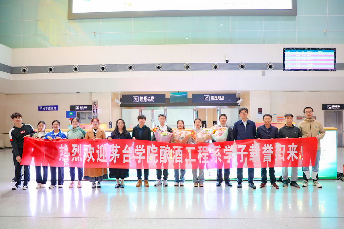 10月13日,茅院学子在“汉酱杯”全国大学生白酒品评技能大赛中载誉归来,副校长张春林、酿酒工程系师生温情接机。