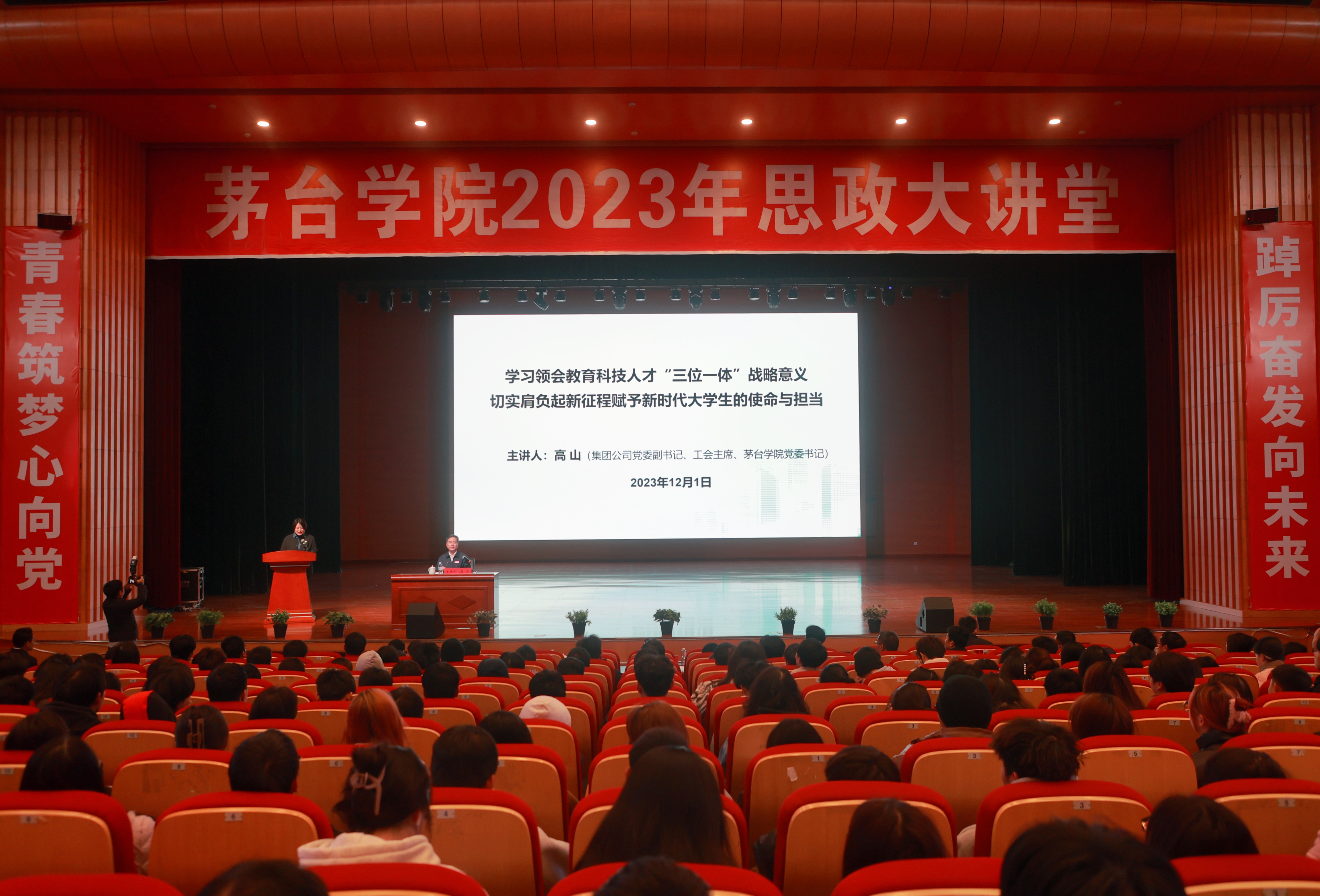 为进一步贯彻落实好党委意识形态工作责任制,带头学习贯彻习近平新时代中国特色社会主义思想,坚持不懈用习近平新时代中国特色社会主义思想铸魂育人,切实让新时代党的创新理论和实践收获转化为广大青年学子坚定理想信念、锤炼政治品格的强大力量,12月1日,茅台集团党委副书记、万象城娱乐awc线路党委书记高山在学校大礼堂,以《学习领会教育科技人才“三位一体”战略意义,切实肩负起新征程赋予新时代大学生的使命与担当》为题,以生动的案例、深刻的剖析为大学生讲授思政课,引导学生深刻领悟“两个确立”的决定性意义,增强“四个意识”、坚定“四个自信”、做到“两个维护”,勇担时代使命,努力在新的长征路上大有作为,让青春在不懈奋斗中绽放绚丽之花。