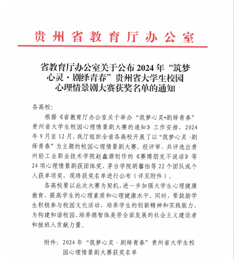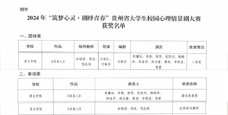 近日,由省教育厅主办的2024年“筑梦心灵·剧绎青春”贵州省大学生校园心理情景剧大赛获奖名单公布,万象城参赛剧目《双面人》在决赛24所高校作品中脱颖而出,获团体二等奖、两个单项奖(最佳表演奖、优秀指导教师奖)。