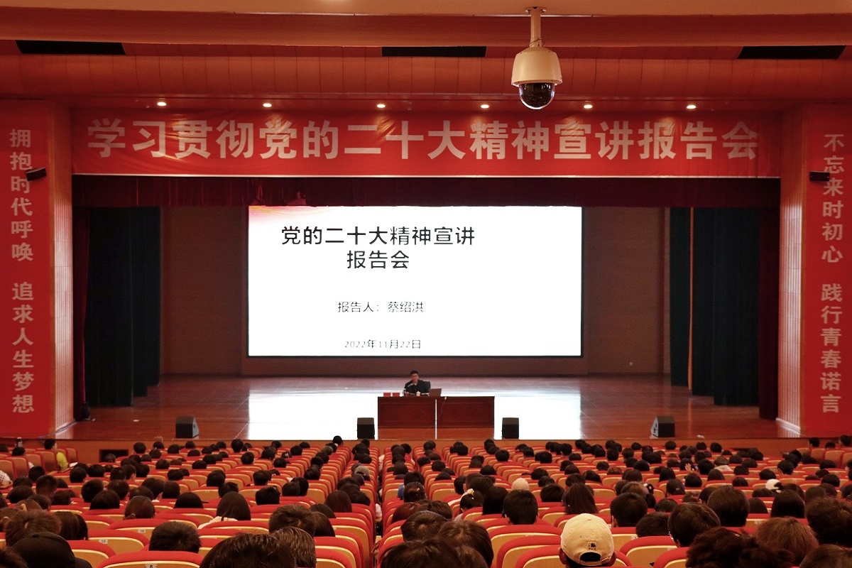 为深入学习宣传贯彻党的二十大精神,让青年学子深刻领悟党的二十大精神要义和丰富内涵,引导其将个人奋斗融入党和人民事业,11月22日,校长蔡绍洪在大礼堂为大一新生宣讲党的二十大精神。