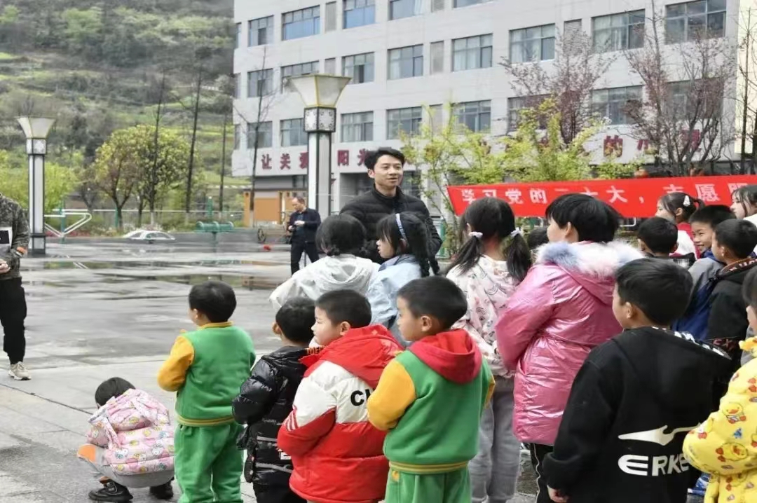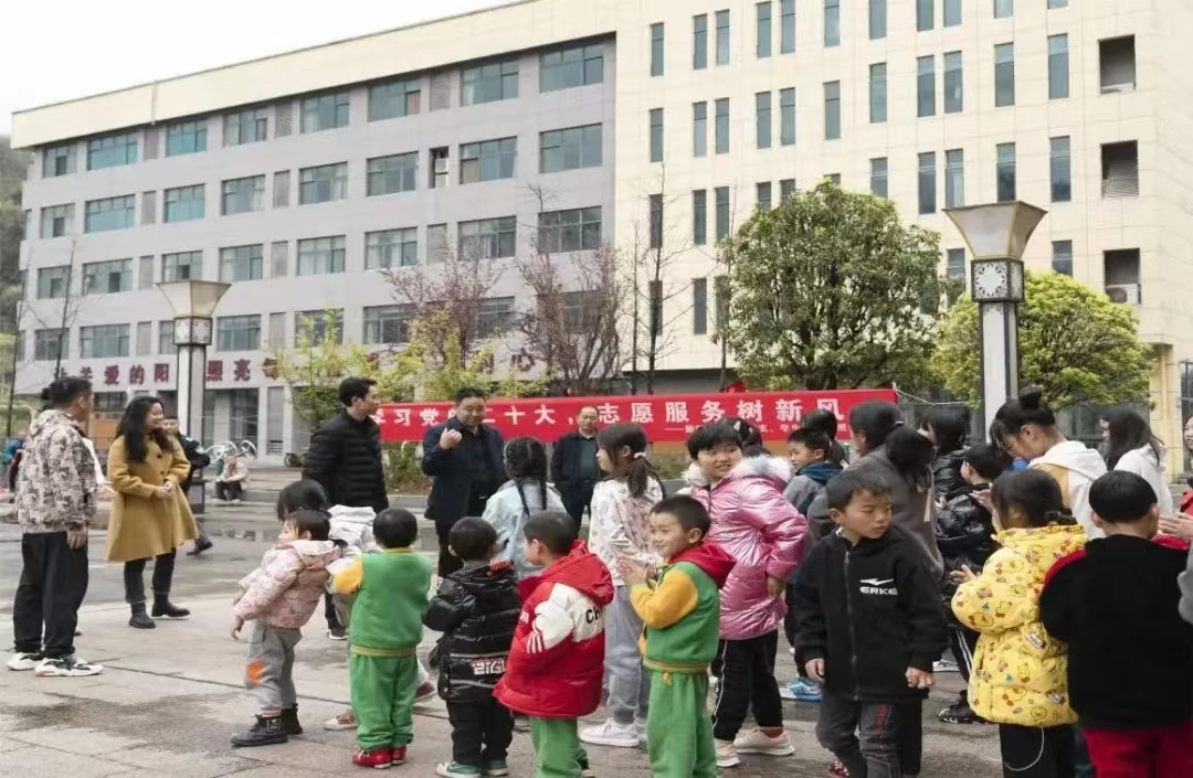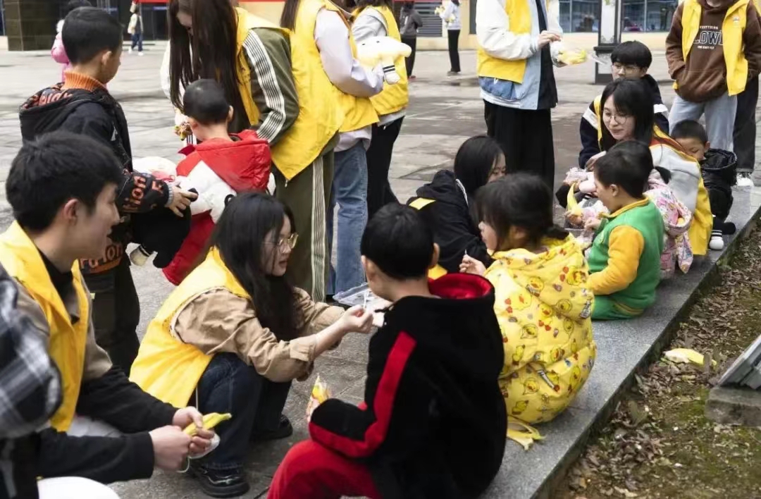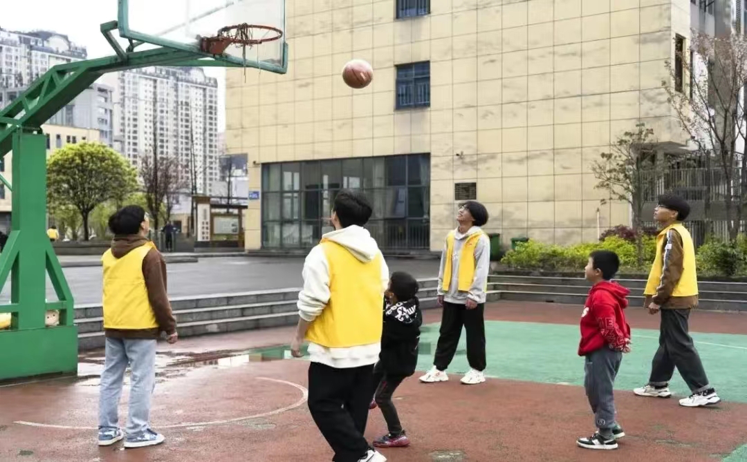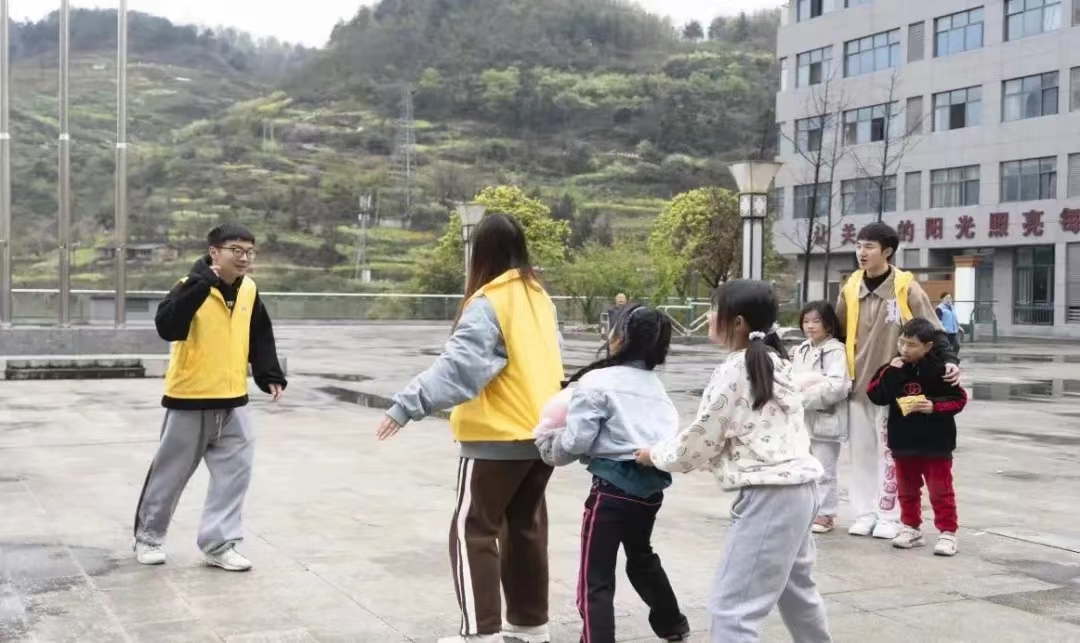 同学们组织小朋友一起玩丢手绢、老鹰捉小鸡、捉迷藏、打篮球等游戏,通过游戏互动和小朋友们建立起初步信任,小朋友们沉浸在游戏的快乐里,脸上洋溢着喜悦笑容。