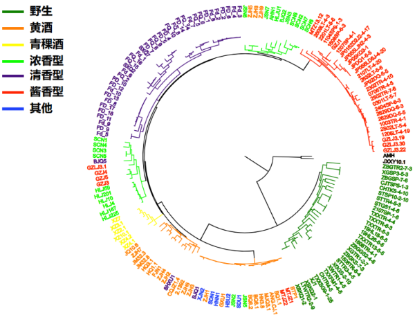 通过SNPs双等位基因构建系统进化树,明确了酱香型白酒酿造过程中酿酒酵母在系统进化树中形成独立分支,与其他来源酿酒酵母存在明显差异,进化树分支支持率为100%。(图2)