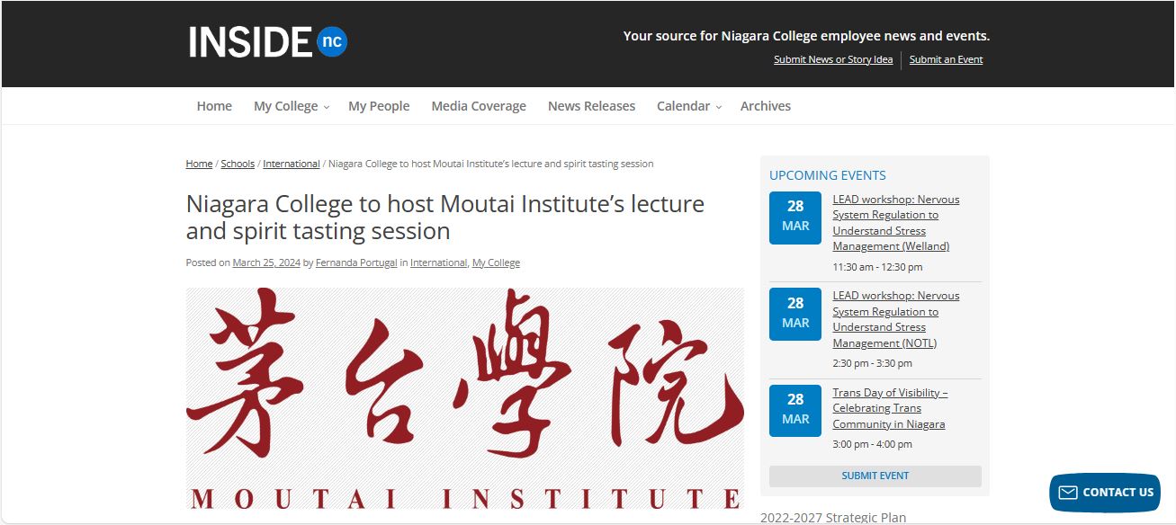 尼亚加拉学院与学校于2018年起建立合作关系,多年来合作来往密切,此次活动是学校首次向国外合作院校做讲座,传播酒文化,也是继2022年尼亚加拉学院为万象城师生开展线上讲座后,基于对中国白酒的兴趣与研究,邀请酿酒工程系对茅台酒的历史和文化,以及白酒品评做详细介绍。