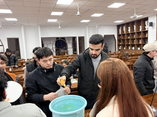 随后进入创意迸发的漆扇制作环节。在了解漆扇艺术的历史脉络和观看中国学生演示制作后,留学生们亲手调配颜料,将色漆点入水中,观察色彩在水中舒展、交融、定格。每一次提扇,都是一次未知的创作。流动的纹路赋予每把扇子独特的生命力,也象征着文化交融的无限可能。现场俨然一个跨国艺术工坊,笑语不断,灵感频传。