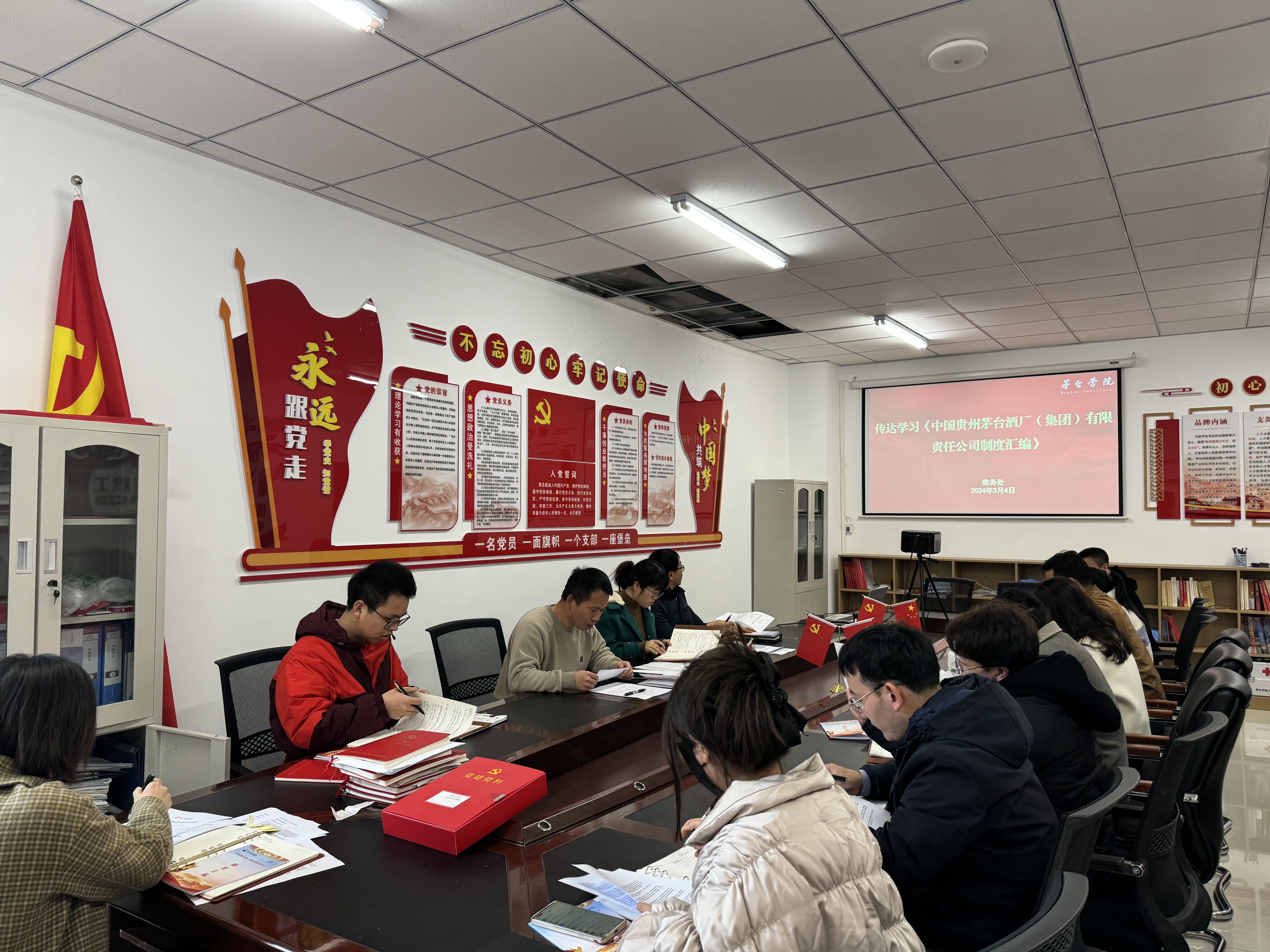 为进一步明晰集团公司各项规章制度流程,严明纪律,规范行为,推动集团公司制度在教务处内部的宣贯和执行。2024年3月4日下午14:00,教务处于行政楼二楼党员活动室召开了专题会,传达学习了《中国贵州茅台酒厂(集团)有限责任公司制度汇编》(以下简称制度汇编)。会议由教务处处长张丰主持,教务处全体人员参加了本次会议。