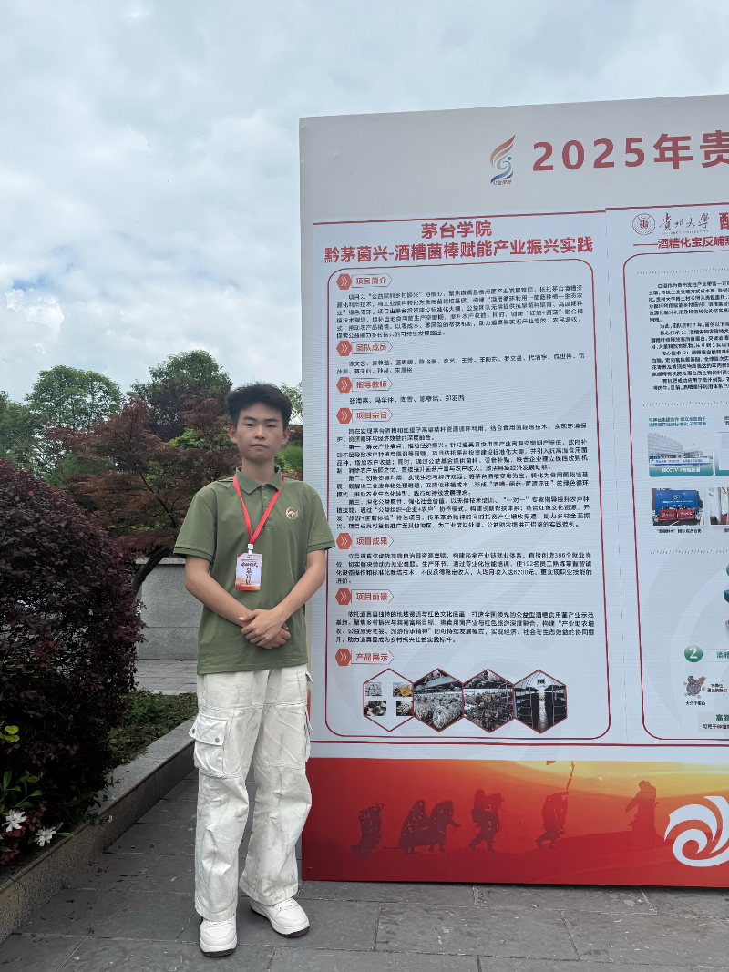 作为全省28所本科高校中唯一展示酒糟循环利用技术的项目,《黔茅菌兴》项目精心设计项目展板参与省级成果展,详细呈现“酒糟→生态菌棒→菌菇种植→助农增收”技术链条,吸引多校专家驻足交流。