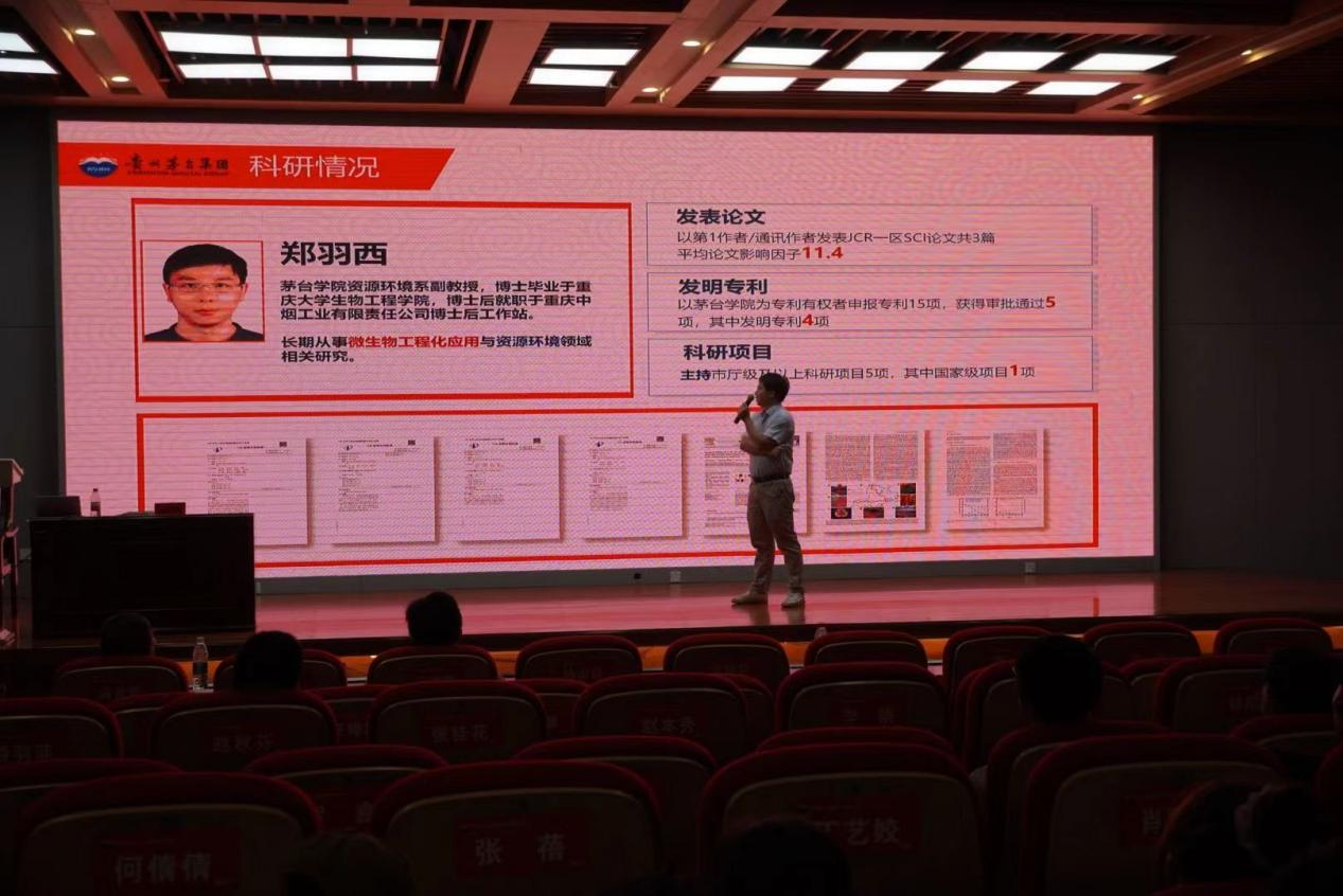 郑羽西老师介绍了自己的研究方向,主要围绕茅台极端微生物的发现、鉴定与机理研究,并介绍了相关研究成果的转化情况。
